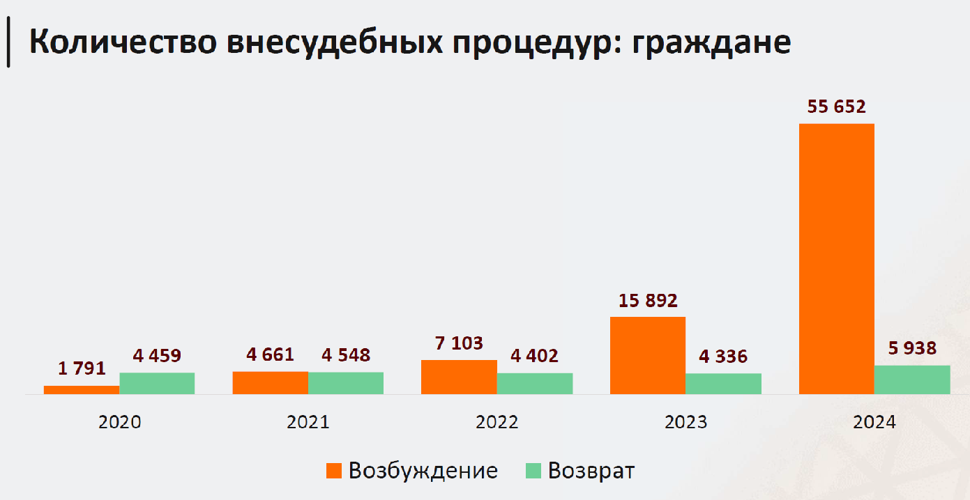Впечатляющие результаты в прошедшем году показало внесудебное банкротство. Законодатели снизили планку требований к должникам, которым доступно списание долгов через МФЦ, и граждане быстро этим воспользовались. В 2024 году было возбуждено 55 652 процедур – в 3,5 раза (!) больше, чем годом ранее.